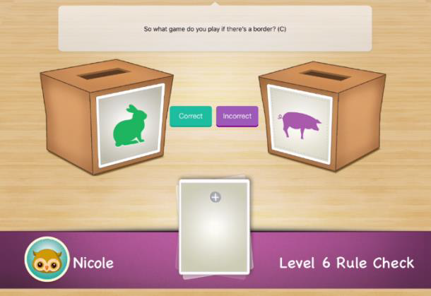 This image shows a screenshot of how the MEFS would appear on a child's technical device. The image includes a speech bubble at the top that reads, "So what game do you play if there’s a border?”. There are two boxes that each have a slot at the top and a picture on the front. The left box shows a picture of a green, rabbit and the right box shows a picture of a purple pig. Next to the left box is a green label that reads, “Correct” and next to the right box is a purple label that reads, “Incorrect.” Between these two boxes, the top card on a stack of cards is blank with no border. At the bottom of the image is a purple ribbon where the child's name and MEFS avatar (an owl) is in the lower left corner and the words, “Level 5 Rule Check,” are in the lower right corner.