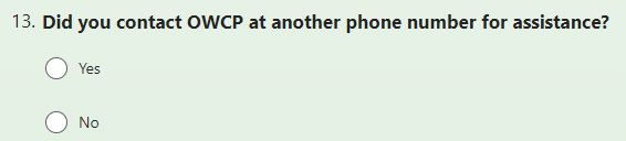The OMB control number for this collection is 1225-0093 and expires on 02/29/2024. According to the Paperwork Reduction Act of 1995, no person is required to respond to a collection of information unless such collection displays a valid OMB control number. The obligation to respond to this collection is voluntary. We estimate it takes about 4 minutes to complete this collection of information, including time for reviewing instructions, searching existing data sources, gathering and maintaining the data needed, and completing the collection of information. Please send comments regarding the burden estimate or any other aspect of this collection of information to the U.S. Department of Labor, Office of Workers’ Compensation Programs, Room S-3524, 200 Constitution Avenue, N.W., Washington D.C. 20210 and reference OMB Control Number 1225-0093. DO NOT SEND THE COMPLETED QUESTIONNAIRE TO THE ABOVE ADDRESS.
