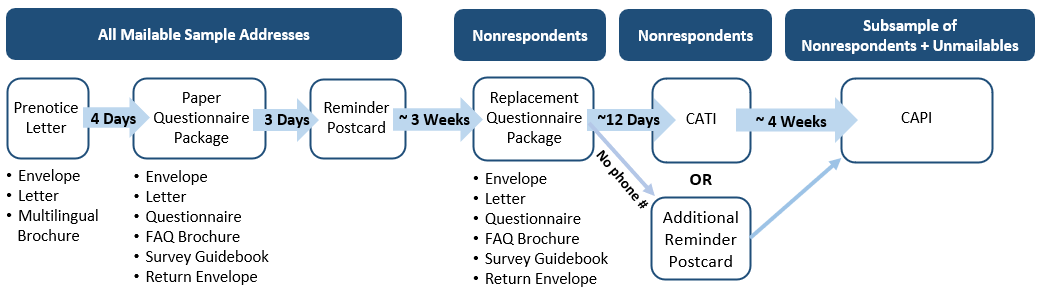 Figure 2 shows the ACS mail contact strategy before the internet response mode was introduced. The ACS program developed the original (2005) ACS mail contact strategy based on the 2000 Census mailing strategy, which included three mailings (prenotice letter, paper questionnaire package, and reminder postcard) followed by a nonresponse follow-up operation. The ACS program made some changes to this strategy, including tailoring language to reflect the survey and mandatory message, shortening the time between the first three mailings, and adding a second questionnaire mailing to nonrespondents.5 The contact strategy also included a Computer-Assisted Telephone Interview (CATI) operation that called nonrespondent households with telephone numbers available to elicit a response before the CAPI operation.