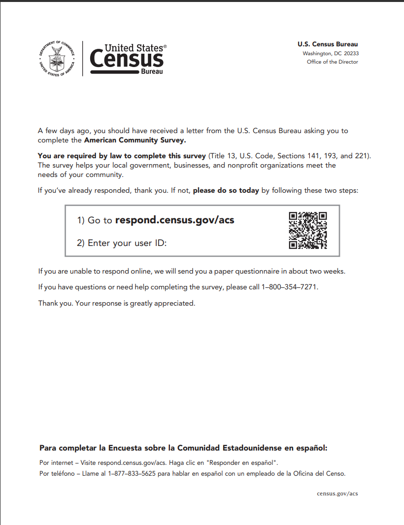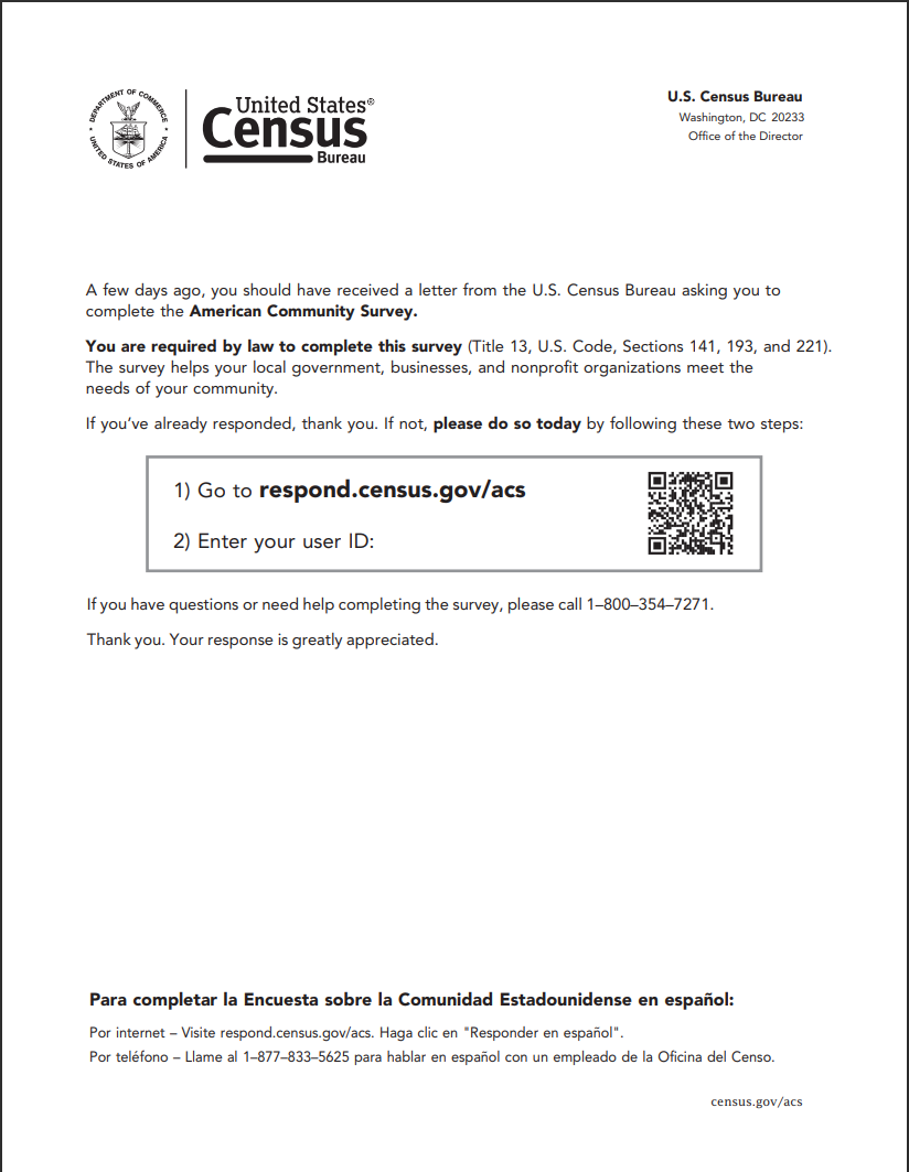 Currently, an ACS respondent must type the URL provided in the mailing materials to access the survey. However, with a QR code, respondents would not have to open a browser and type in the URL, and instead they could simply scan the code with their smart device. Providing a QR code might be helpful for respondents to access the survey quicker, reducing respondent burden.1