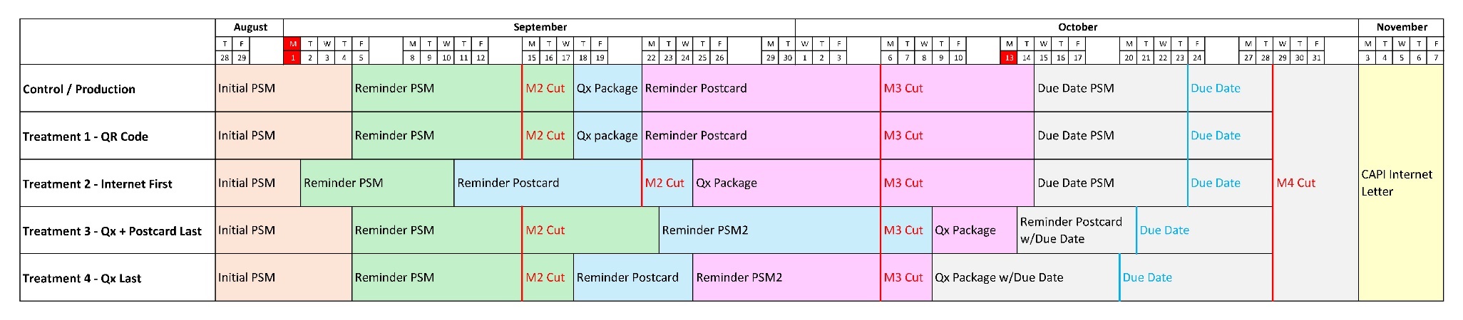 11 We are not including a treatment that only removes the reference from the first mailing. Removing the reference from the first two mailings in Treatments 2-4 aligns with the various questionnaire timings since the questionnaire will no longer be received within a few weeks. Additionally, the 2021 IMPS Test showed that removing the paper questionnaire reference from the first mailing increased self-response in early data collection compared to the de-emphasized message in control and Treatment 1 (Longsine & Spiers, 2023). Thus, since it has already been proven effective, we are not retesting the message removal in the first mailing alone.