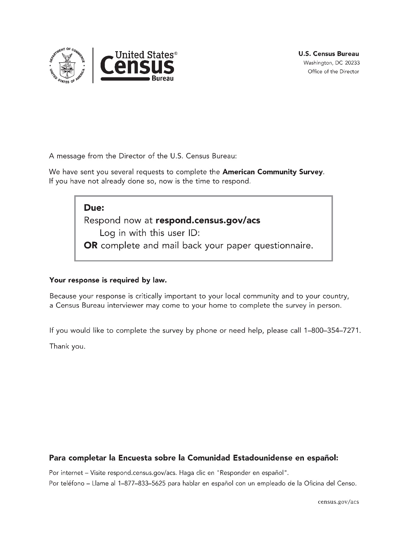 The Census Bureau sends the first two mailings to all mailable addresses in the monthly sample. These addresses comprise the initial mailing universe (M1). The first mailing is an initial pressure seal mailer that includes an internet user ID and instructions for how to respond online. It also provides the Telephone Questionnaire Assistance (TQA) phone number which respondents can call if they have questions or need help. A week later, the same addresses are sent a second mailing – a reminder pressure seal mailer.