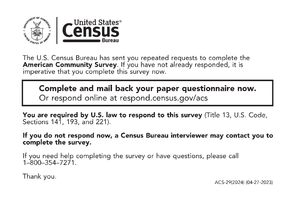 To encourage self-response, the Census Bureau sends as many as six mailings to a mailable sampled address. The list of mailable sampled addresses is updated three times during this process to remove households that have responded. The sooner an ACS response is received from a household, the fewer mailings we send to that address.