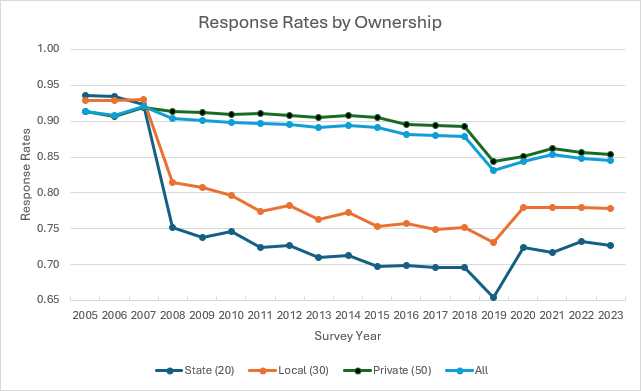 For the 2025 survey, 42 states plus the District of Columbia plan to participate in the survey. For the remaining eight states which are referred to as Non-State Grantees (NSG), a smaller sample is selected and collected by BLS regional offices to provide data which contribute to national estimates only. The eight NSG states for 2025 are: