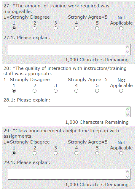 For questions 24-29, selecting a rating of 1 or 2 displays the follow-up question.