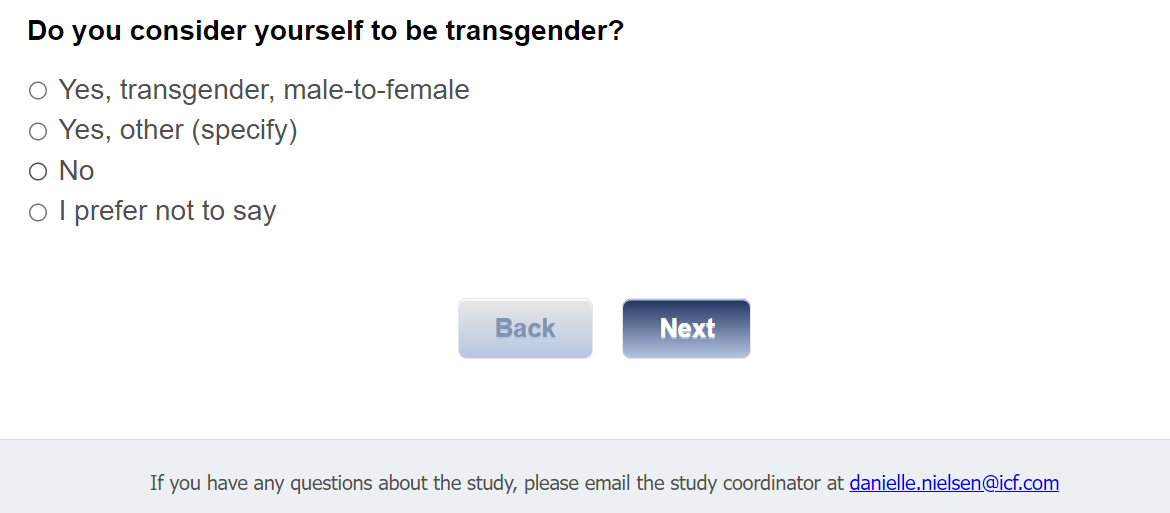 Today, we are screening people for eligibility for this study. Your participation in this screening process is completely voluntary and requires 5-8 minutes of your time to answer questions. Your answers are completely anonymous and confidential. If you meet the eligibility criteria outlined for this study, you will immediately be asked to complete a brief survey. Please reach out to Danielle Nielsen, ICF project manager, with any questions before, during, or after completing this screener.