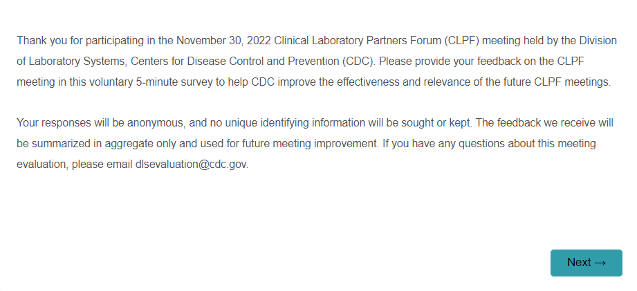 Public reporting burden of this collection of information is estimated to average 5 minutes per response, including the time for reviewing instructions, searching existing data sources, gathering and maintaining the data needed, and completing and reviewing the collection of information. An agency may not conduct or sponsor, and a person is not required to respond to a collection of information unless it displays a currently valid OMB control number. Send comments regarding this burden estimate or any other aspect of this collection of information, including suggestions for reducing this burden to CDC/ATSDR Reports Clearance Officer; 1600 Clifton Road NE, MS D-74, Atlanta, Georgia 30333; ATTN: PRA (0920-1050).