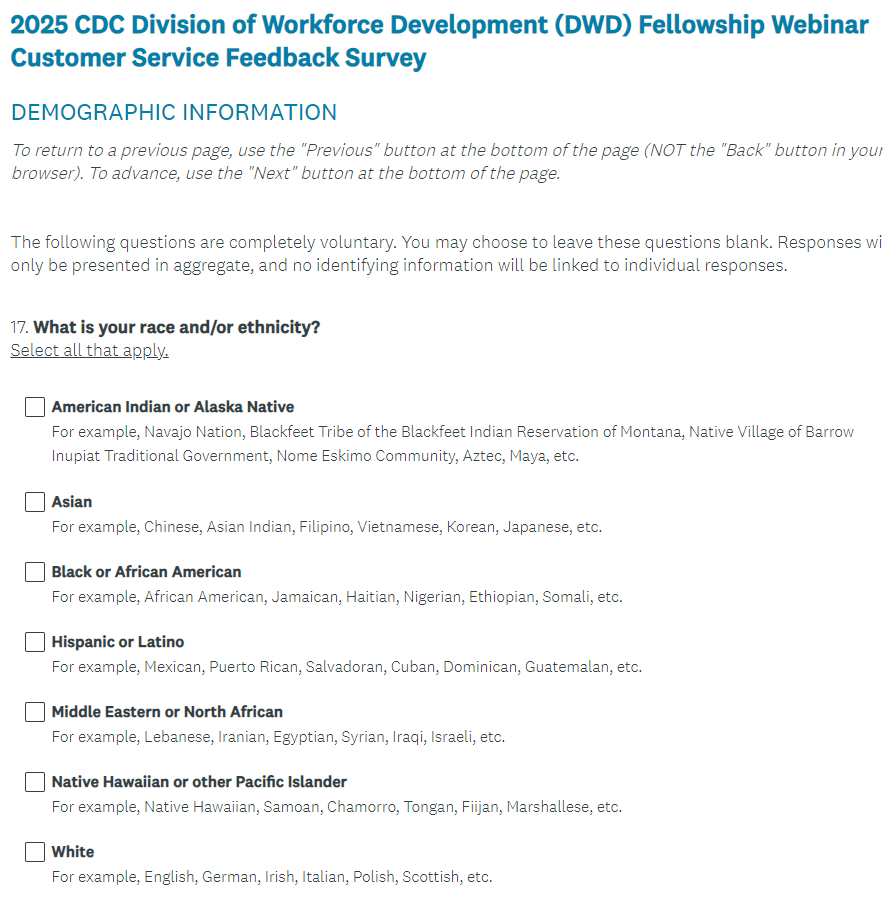 2025 CDC Division of Workforce Development (DWD) Fellowship Webinar Customer Service Feedback Survey (screenshots)
