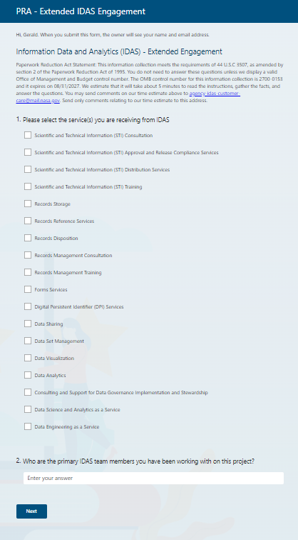 Paperwork Reduction Act Statement: This information collection meets the requirements of 44 U.S.C 3507, as amended by section 2 of the Paperwork Reduction Act of 1995. You do not need to answer these questions unless we display a valid Office of Management and Budget control number. The OMB control number for this information collection is 2700-0153 and it expires on 08/31/2027. We estimate that it will take about 5 minutes to read the instructions, gather the facts, and answer the questions. You may send comments on our time estimate above to agency-idas-customer-care@mail.nasa.gov. Send only comments relating to our time estimate to this address.