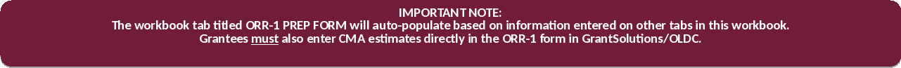 | These INSTRUCTIONS follow the format of the ORR-1 form and refer to related worksheets in the ORR-1 Instructions and Budget Workbook. Each worksheet follows the instructions included on this tab, with additional detail dispersed throughout relevant sections of the worksheet to walk you through completion of each sections. The worksheets are locked to eliminate errors in calculations. The ORR-1 PREP FORM will auto-populate based on information entered into each section of the workbook. You should use this information to populate the ORR-1 form in the Grant Solutions On-Line Data Collection. You must upload the ORR-1 budget workbook as an attachment to the ORR-1 form. |