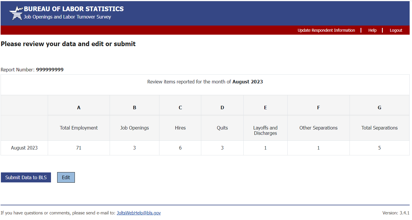 Data to BLS” button to finish, or the “Edit”