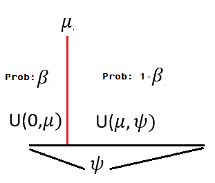 As before, we begin item imputation by drawing from a Uniform distribution, U(0,1), to determine if the imputed rate is to be drawn from the “BELOW” uniform distribution or the “ABOVE” uniform distribution. If the value of the U(0,1) is less than or equal to β then we will draw from the “BELOW” uniform distribution, otherwise we will draw from the “ABOVE” distribution.