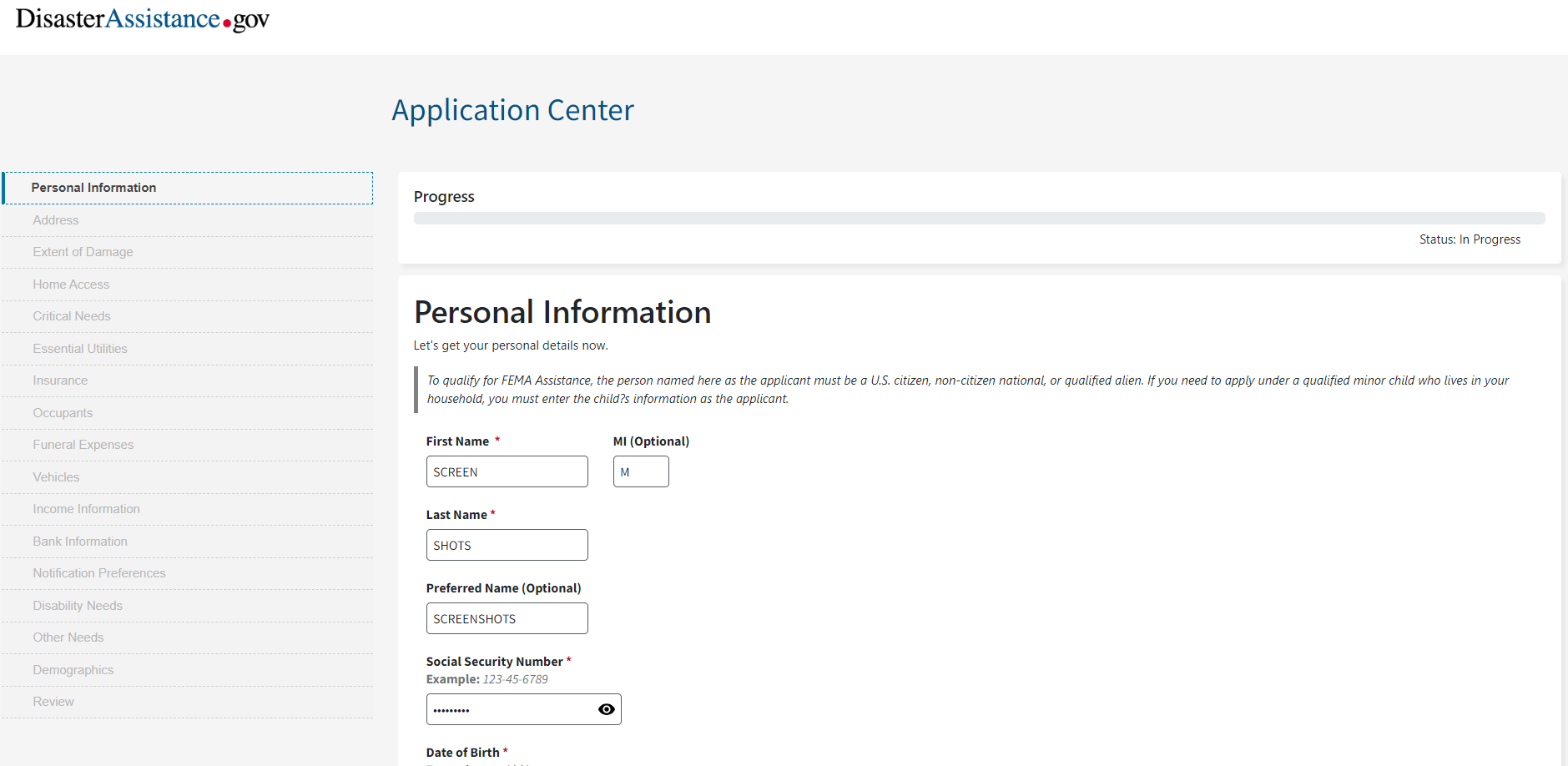 Personal Information Screen