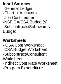 Cooperative Support Agreement Cost Worksheet: The purpose of the CSA Cost Worksheet is to reconcile costs from the Job Cost Ledger for all award CSAs. A separate CSA table will be added to the CSA cost worksheet based on the number of CSAs entered in the Setup tab once you hit "Run Setup". If you need to add additional CSAs after "RUN SETUP" has run, use the "Add New CSA" Button on the CSA Cost Worksheet Tab. Input your current year expenditures from your Job Cost Ledger and any adjustments in each of the cost categories. Add any additional comments, which can provide clarity or explanation to the reviewer on costs. *Fee must be included in row K. For awards which do not have the amount listed in this line of their budget, add a note in the tab Accounting Notes Worksheet. Fee is not included as part of Total Direct Costs. **For purposes of reporting “Claimed Direct Costs,” costs incurred using “contingency funds” should be reported within the cost category into which they would naturally fall. ***Program Income should not be included in your costs but provided on the Program Income Reporting Worksheet per the "Proposal and Awards Policies and Procedures Guide".
