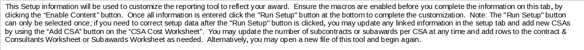 Setup: Complete this tab first as it will customize this reporting tool for your award. Ensure the macros are enabled before you complete the information on this tab, by clicking the “Enable Content” button. Input your institution and award data as requested. Your award data should agree with the information listed in your CA and subsequent CSA(s). Once you have entered all the required information including the number of CSAs in the Award Data box and select "RUN SETUP" you will start to enter information into each of the tabs starting with the CSA Cost Worksheet and then the CSA Budget Worksheet and then the Contract/Consultant Worksheet, etc. Go in order of the worksheets from left to right. If you need to add additional CSAs after "RUN SETUP" has run, use the "Add New CSA" Button on the CSA Cost Worksheet Tab. This button will allow you to add a new CSA table throughout the Tool.