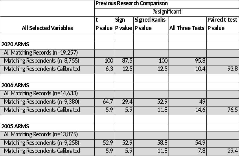 Paired t tests suggest the null hypotheses of “No Mean Bias Reductions” are rejected for fifteen of the sixteen study variables. The current rate of significant Mean Bias Reductions of 93.8 is well above the 29.4 and 76.5 percent found in 2005 and 2006, respectively. A possible explanation for the improvements in paired t test may be that a richer set of calibration targets were used in 2020 relative to the previous studies. Over time, NASS has evolved the targeted data set from about twelve targets in 2002, to about thirty targets in 2020. The 2005 and 2006 studies used twelve targets.