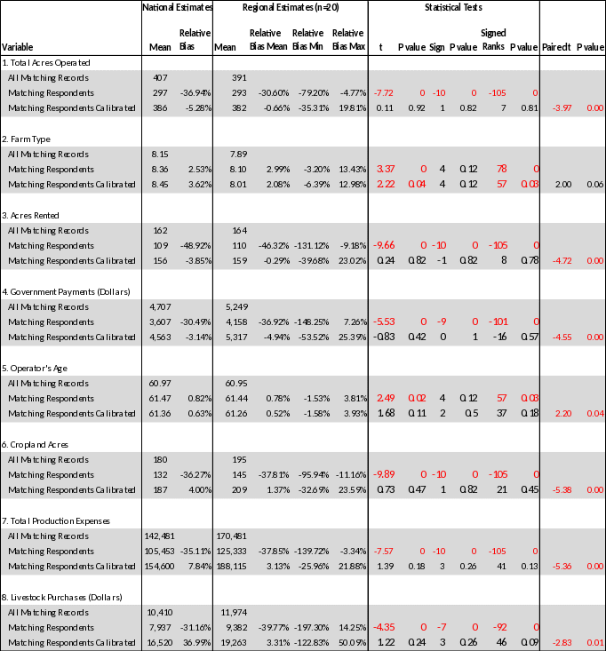 Limitations of this analysis include: 1) Slight calibration target mismatches between production ARMS and this research, namely egg and milk production; 2) Statistical tests in this research are based on matching farms responding to the 2017 Census of Agriculture; and 3) no statistical tests produced for subregional relative biases.