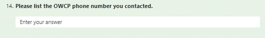 The OMB control number for this collection is 1225-0093 and expires on 02/29/2024. According to the Paperwork Reduction Act of 1995, no person is required to respond to a collection of information unless such collection displays a valid OMB control number. The obligation to respond to this collection is voluntary. We estimate it takes about 4 minutes to complete this collection of information, including time for reviewing instructions, searching existing data sources, gathering and maintaining the data needed, and completing the collection of information. Please send comments regarding the burden estimate or any other aspect of this collection of information to the U.S. Department of Labor, Office of Workers’ Compensation Programs, Room S-3524, 200 Constitution Avenue, N.W., Washington D.C. 20210 and reference OMB Control Number 1225-0093. DO NOT SEND THE COMPLETED QUESTIONNAIRE TO THE ABOVE ADDRESS.
