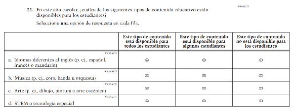 This Item was developed to measure students’ learning environments and access to educational content focused on languages, music, art, and STEM.