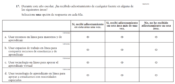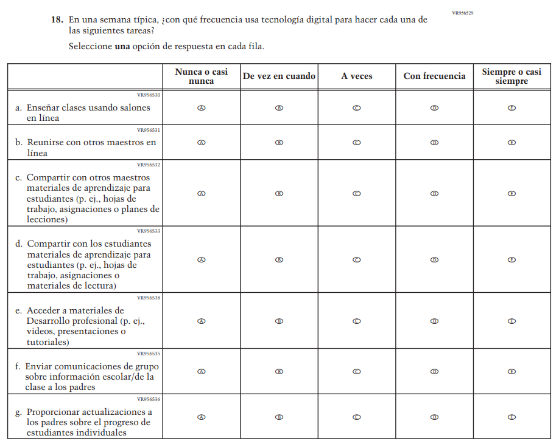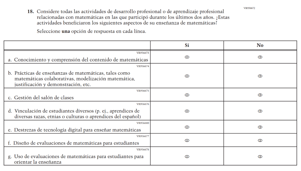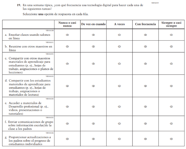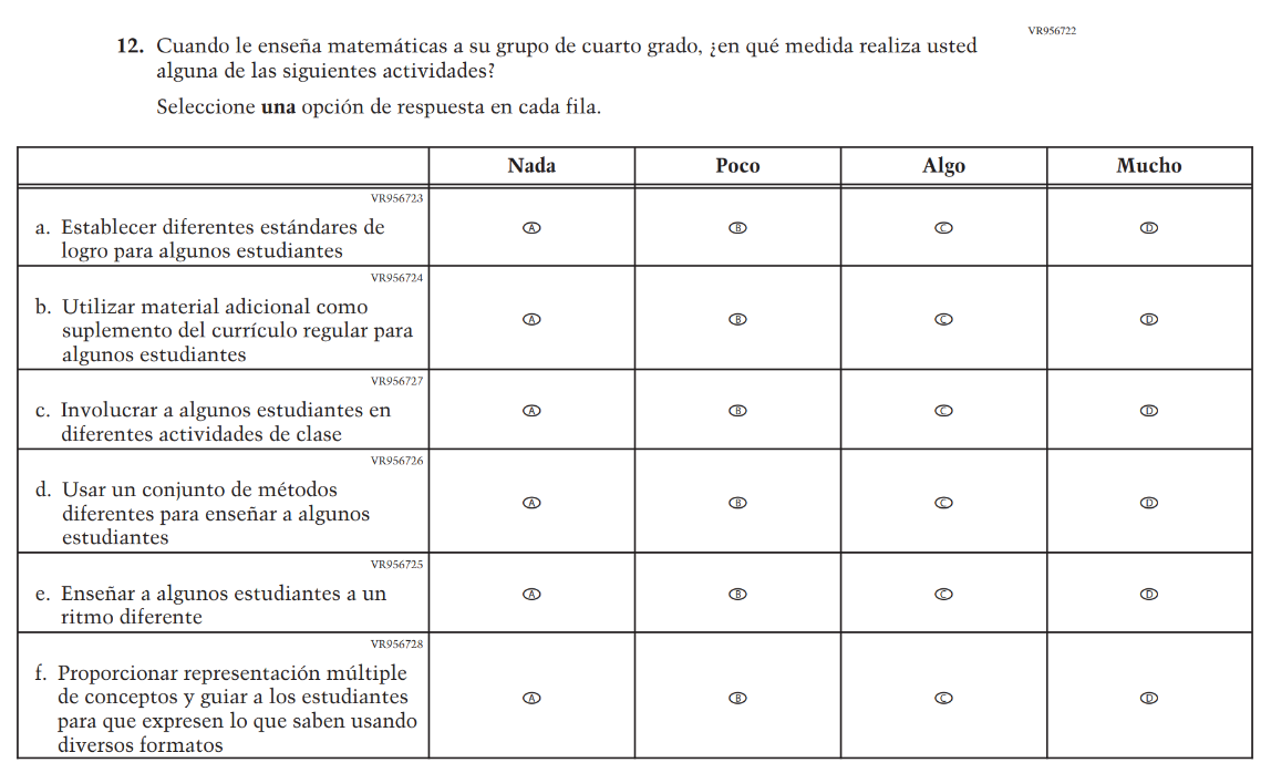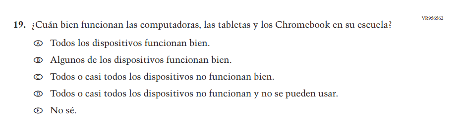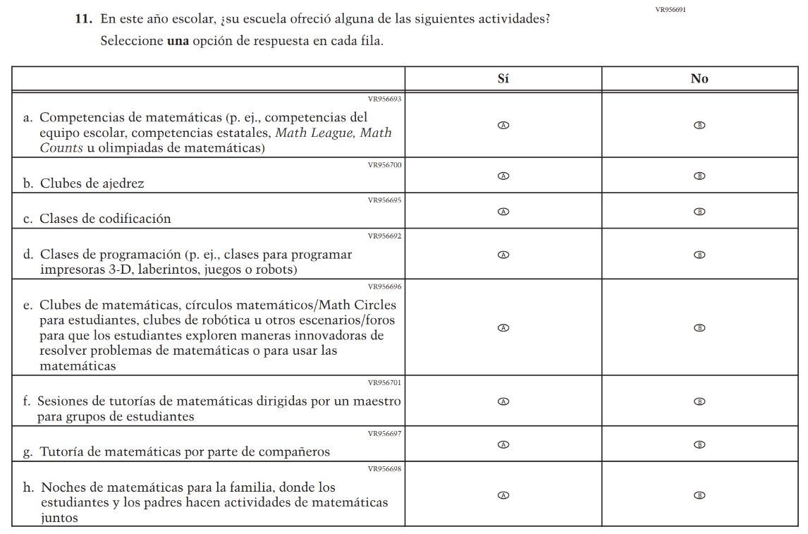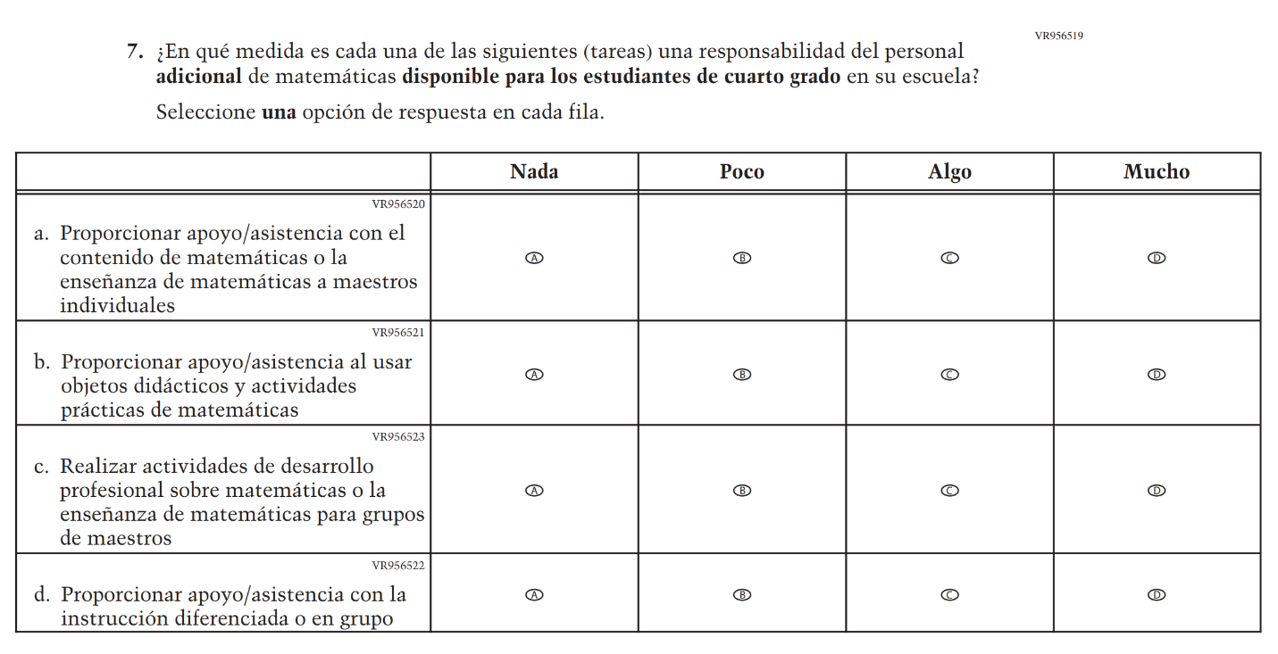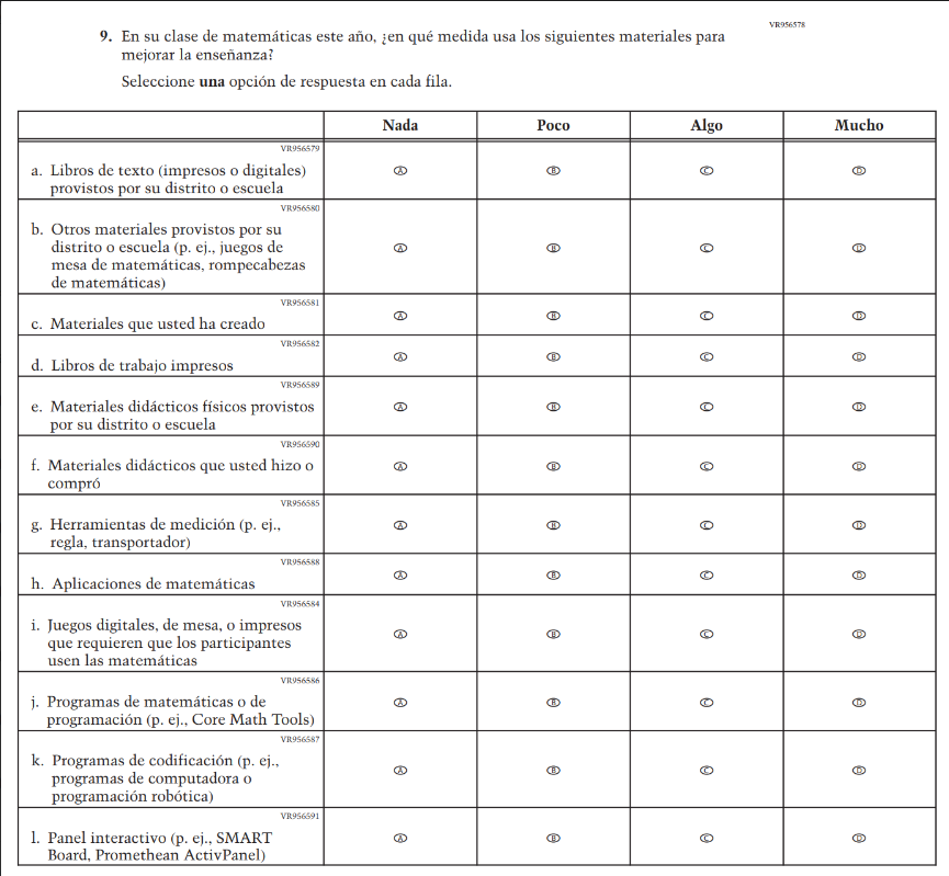 Appendix J-S provides Operational and Pilot Spanish student, teacher, and school survey questionnaires that will be administered in 2026. Summary tables reflect any changes to the items from the 2024 administration. Please note, some of the numbers of the items may be missing or out of order in these printed versions. This will be corrected in the platform view.