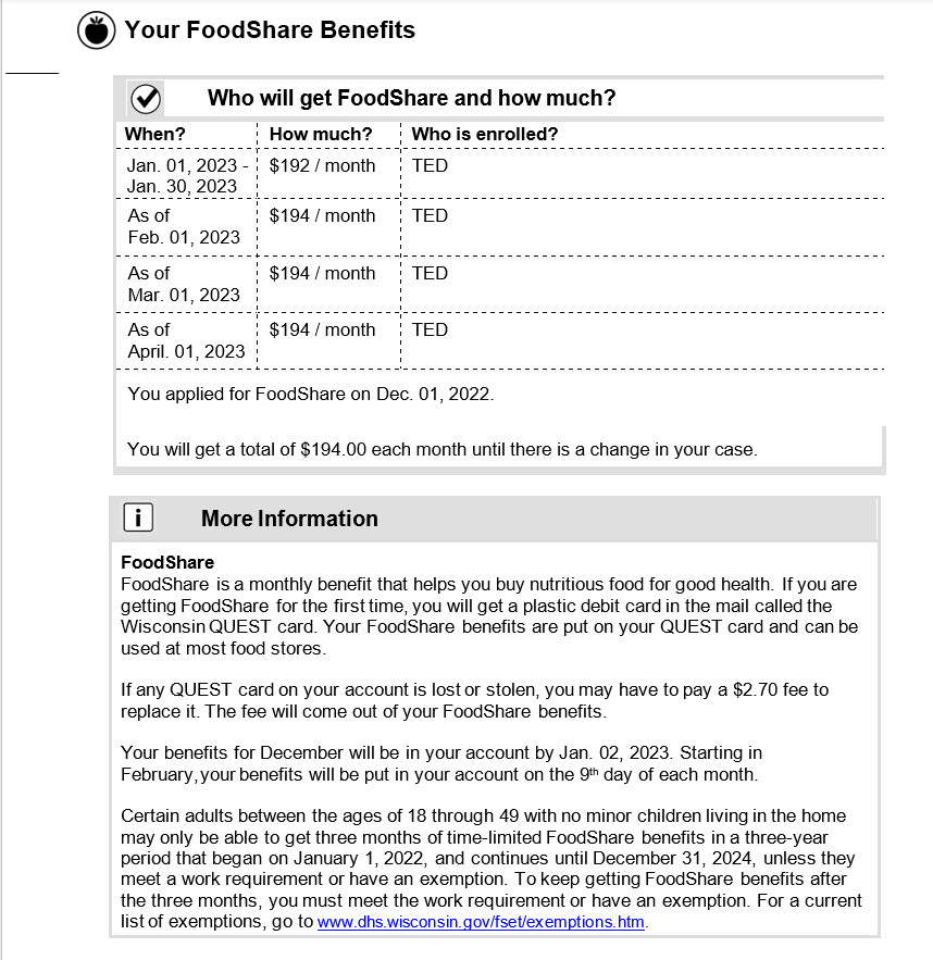 Here is a letter that someone receiving FoodShare benefits might receive. Please take a few minutes to read the letter and then we will talk about it. If needed: Please remember to say what comes to mind as you are reading.