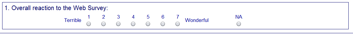 Please Note: The questionnaire will be electronic with word labels on either end of 7 radio buttons. See image below for an idea of what the final format will look like.