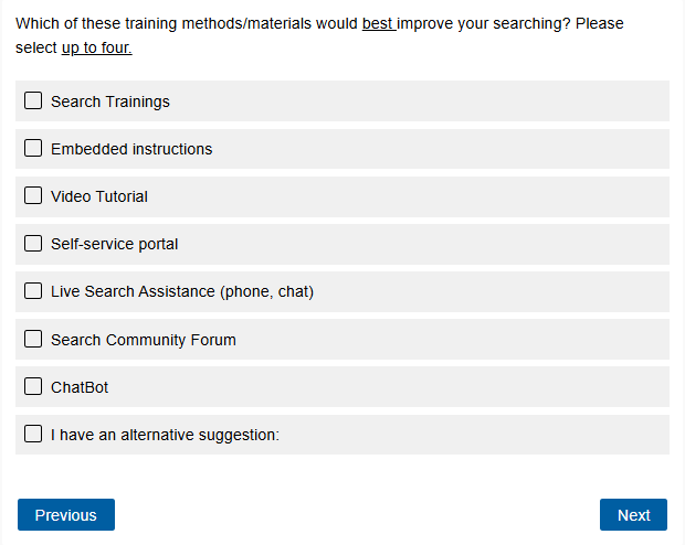Which of these training methods/materials would best improve your searching? Please select up to four.