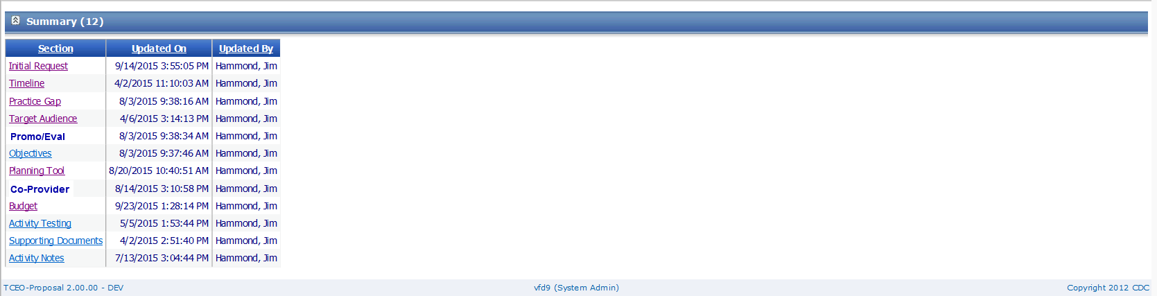 The major pages, sections, and subsections of the CE Proposal are detailed in this document. Following the screenshots for each section is a table that shows the display properties of the collection of data elements.