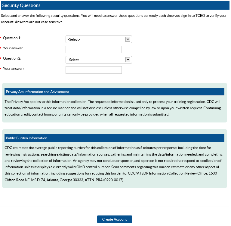 To create an account in the Training and Continuing Education Online System (TCEO) participants are required to complete the data fields shown in the Create Account screen (Figure 1). The data element options to create an account are shown in Table 1.