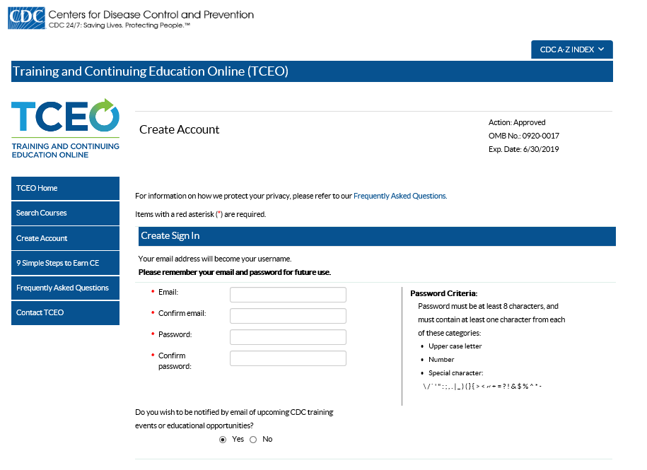 The purpose of this document is to list all data elements collected online from the learners that wish to obtain continuing education credit through the Centers for Disease Control and Prevention’s (CDC) Training and Continuing Education Online System (TCEO).