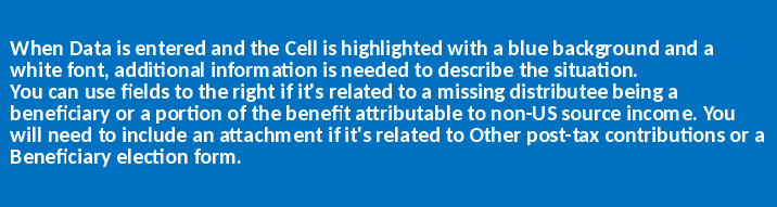 | f) | If the Missing Distributee is a Beneficiary, list the beneficiary's information and include an attachment, or use the Beneficiary tab, to include the originating Participant and why the beneficiary is due money | |||||