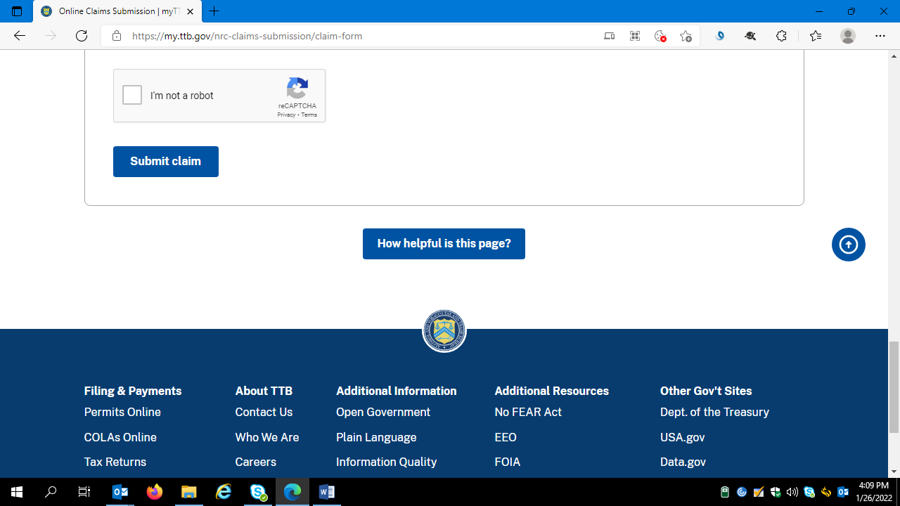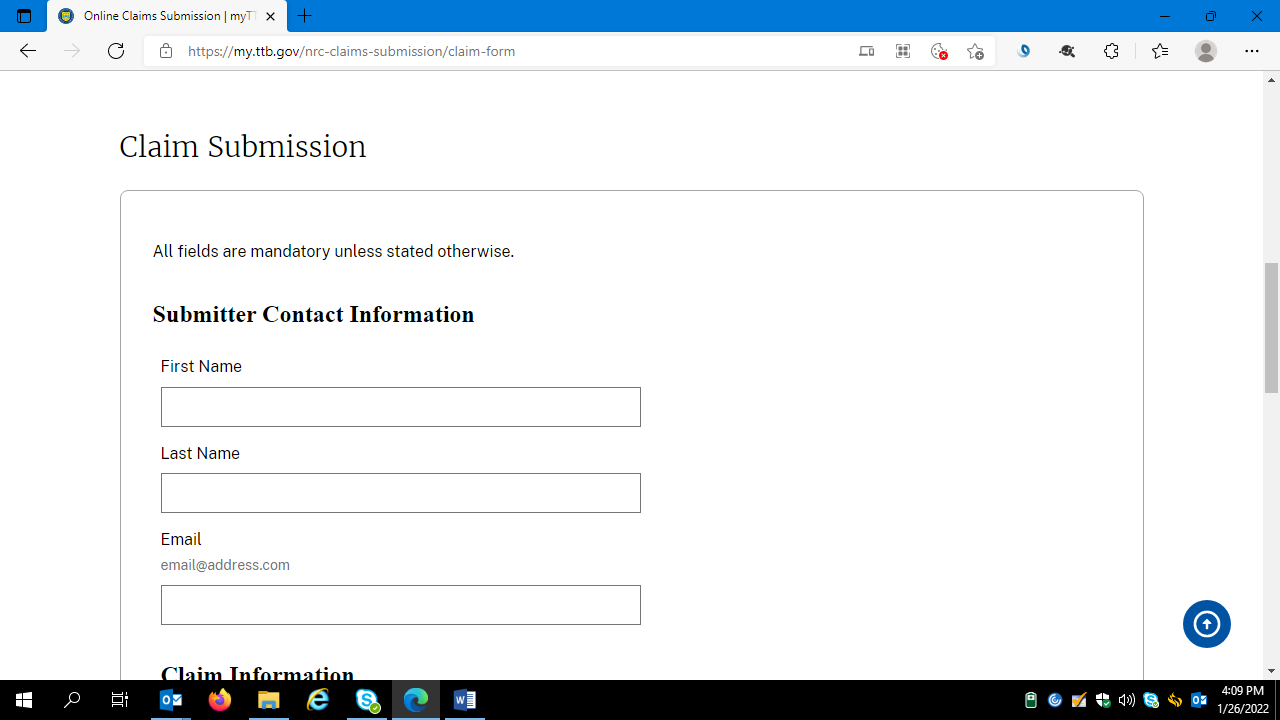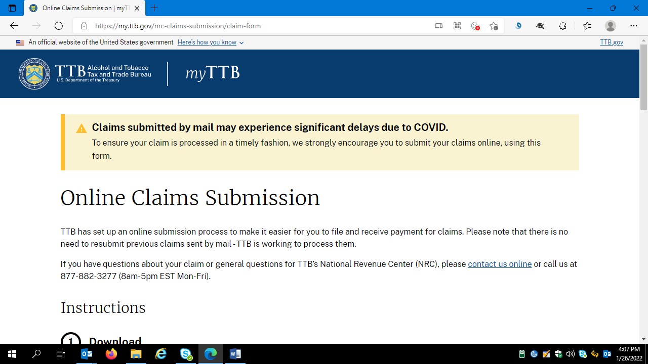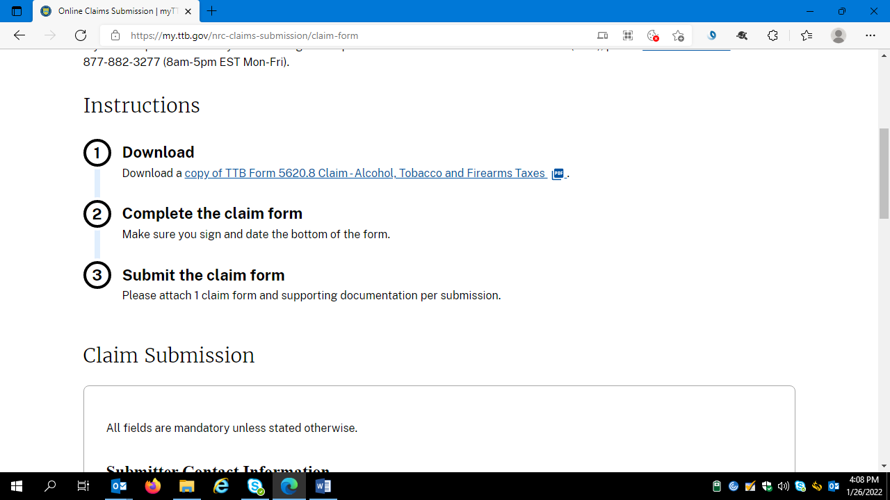 After downloading and completing a fillable-printable TTB F 5620.8 form from the TTB website (https://www.ttb.gov/forms), respondents may electronically upload and submit the completed form and any required supporting documents to TTB via the Online Claims Submission portal on the TTB website at https://my.ttb.gov/nrc-claims-submission/claim-form.