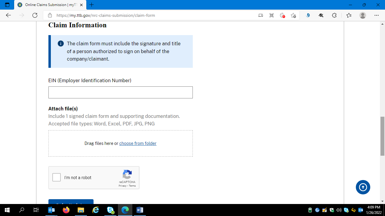 Respondents complete the Claim Information data fields and attach a copy of one completed and signed TTB F 5620.8, along with any required supporting documents: