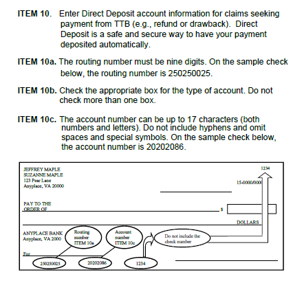 In response to E.O. 14247, on form TTB F 5620.8, TTB is making minor changes to Item 10 and its related instructions to require respondents to provide direct deposit information for claims made seeking payment from TTB (e.g. refund or drawback of tax). For claims involving drawback or refund of tax, Item 10 previously displayed a parenthetical note that Direct Deposit was optional. Item 10 will now display a note that Direct Deposit is “for refund/drawback.” This eliminates the respondent’s option to receive a paper check for such payments. Items 10a, 10b, and 10c, which collect the claimant’s bank routing number, type of account (checking or savings), and their account number remain unchanged. TTB also is revising the instruction for Item 10 to state that the respondent must enter their direct deposit information when filing a claim seeking payment from TTB. The instructions for Items 10a, 10b, and 10c remain the same as on the previous edition of the form but, for clarity, TTB has placed the figure showing the location of bank routing and account number on a check after the instructions for Item 10c rather than before that instruction.
