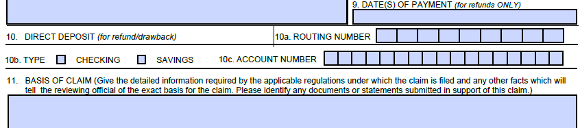 The figures below show the previous version of Item 10 and its instructions on TTB F 5620.8, which allowed the respondent to provide direct deposit information as an option for the payment of drawback or refund of tax: