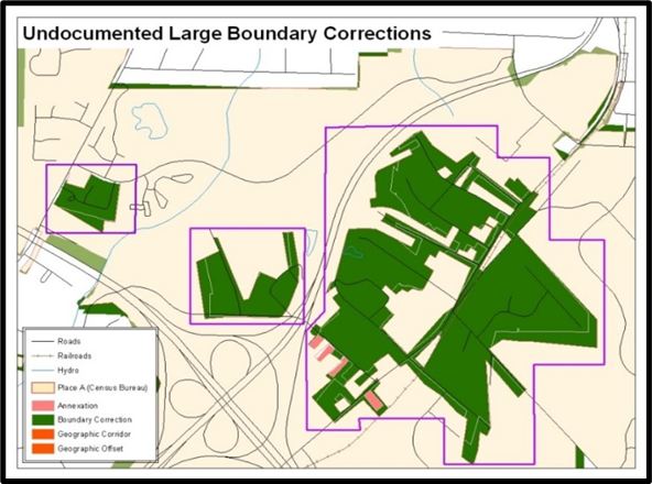 A shapefile of boundary change polygons based off the current Census Bureau boundary. Submissions containing only a whole entity boundary shapefile of the current local data will not be accepted.