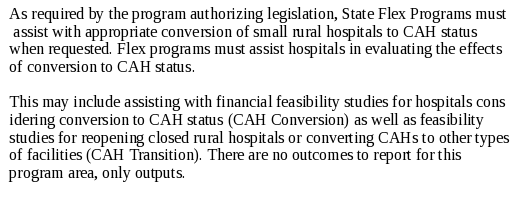| Program Area Impact Goal: Support rural hospitals who want to seek or maintain appropriate Medicare participation status to meet community needs | |||||