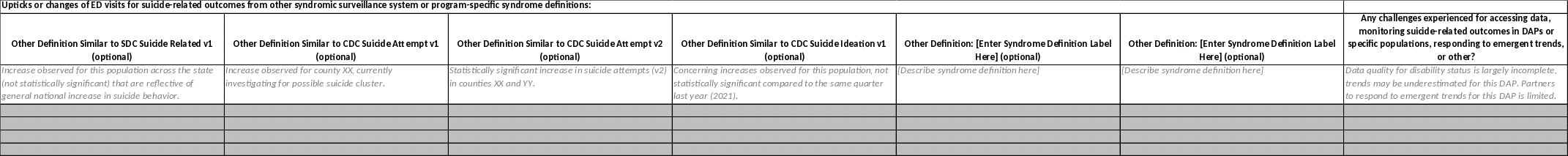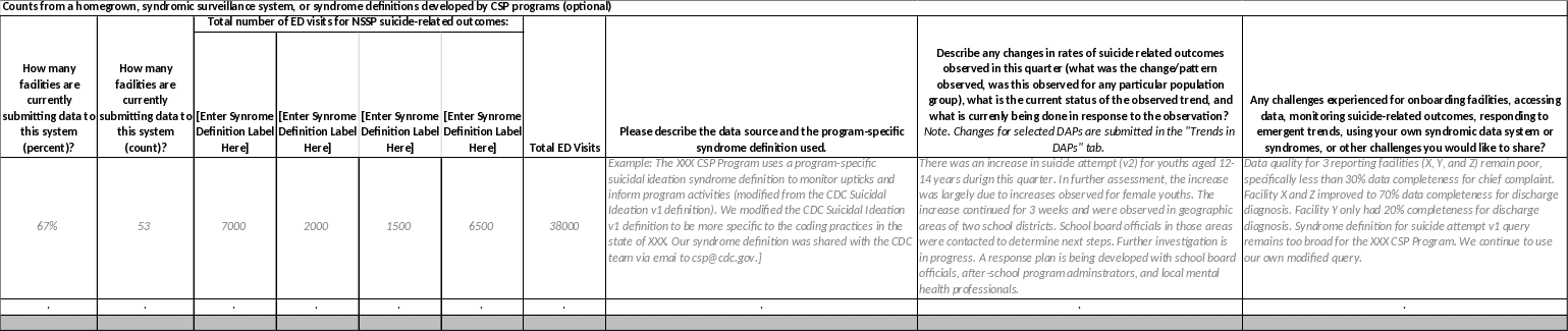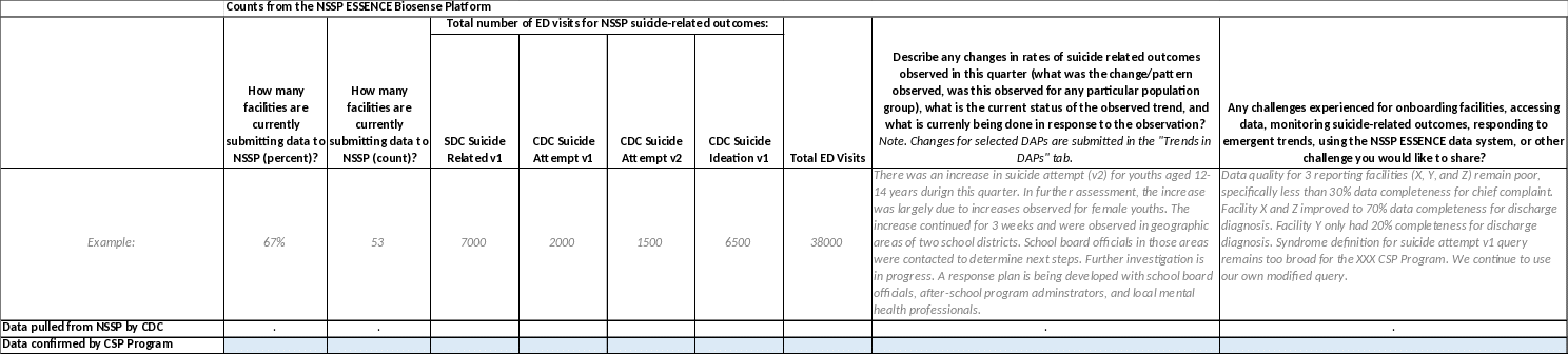 Specific Syndromic Report Instructions: For ED visit counts, please confirm the count obtained by CDC by using data from the NSSP ESSENCE Biosense Platform. Suicide Syndromic Surveillance Definitions included in each submission are the SDC Suicide Related (v1), CDC Suicidal Ideation (v1), and CDC Suicide Attempt (v1 and v2). All of these definitions are incorporated into NSSP ESSENCE for use and applied to specific fields. CSP programs are able to use homegrown systems, modify these syndrome definitions, and use different parameters when conducting syndromic surveillance, however, CSP programs must use these same syndrome definitions and query parameters in NSSP ESSENCE to confirm the counts in this report. More details on query parameters will be shared when each report is shared with CSP programs for completion each quarter. Feel free to share any feedback your program has on the use of available syndrome definitions and specified query parameters. |