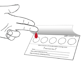 Abra la tapa de la tarjeta de sangre para exponer los círculos en el papel de recolección de sangre. No toque el papel de recolección de sangre (es decir, círculos).