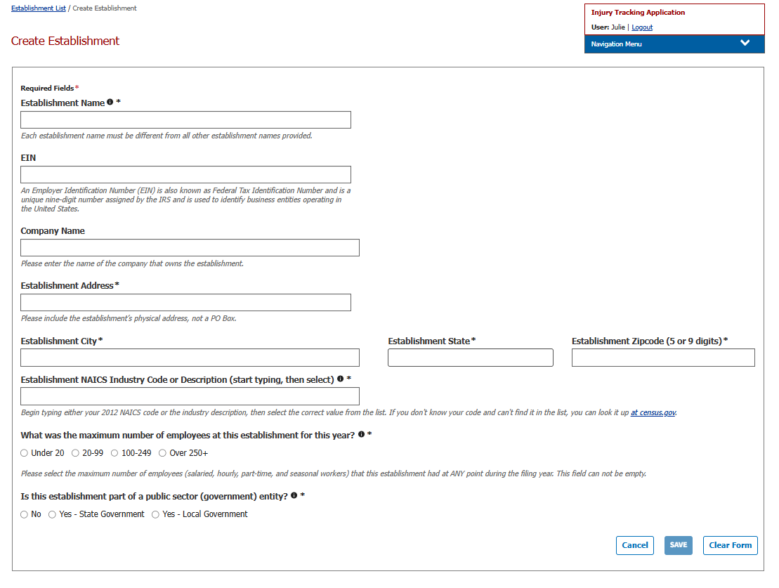 Create Establishment (aka EIN page)