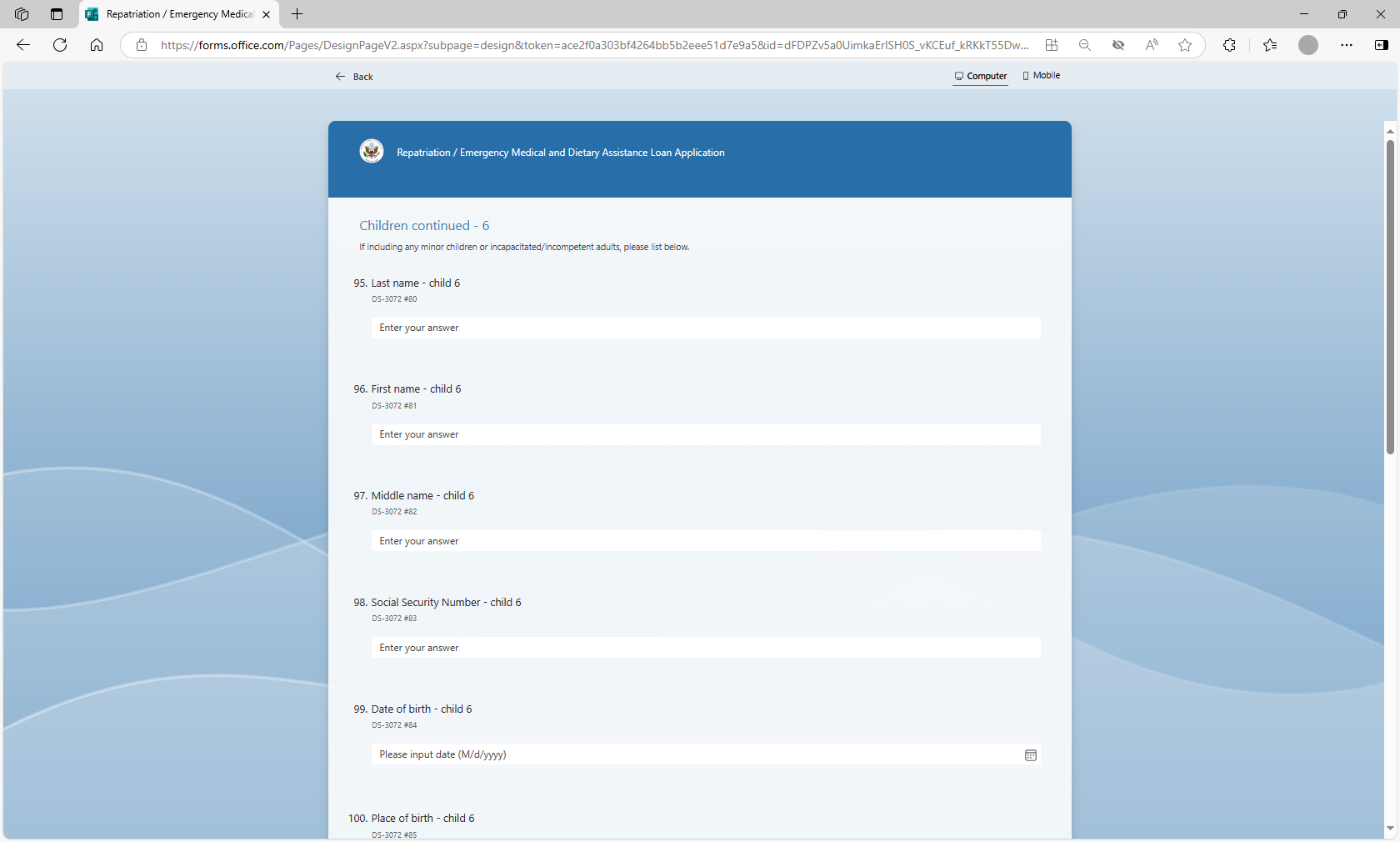 The MS form will be utilized by loan applicants to more efficiently submit their information for a repatriation or EMDA loan application to U.S. posts abroad. Posts will utilize the MS Forms tool to auto populate the form DS-3072 to prepare the form prior to the applicant’s arrival at the U.S. Consulate or Embassy, thereby streamlining the application review and approval process.
