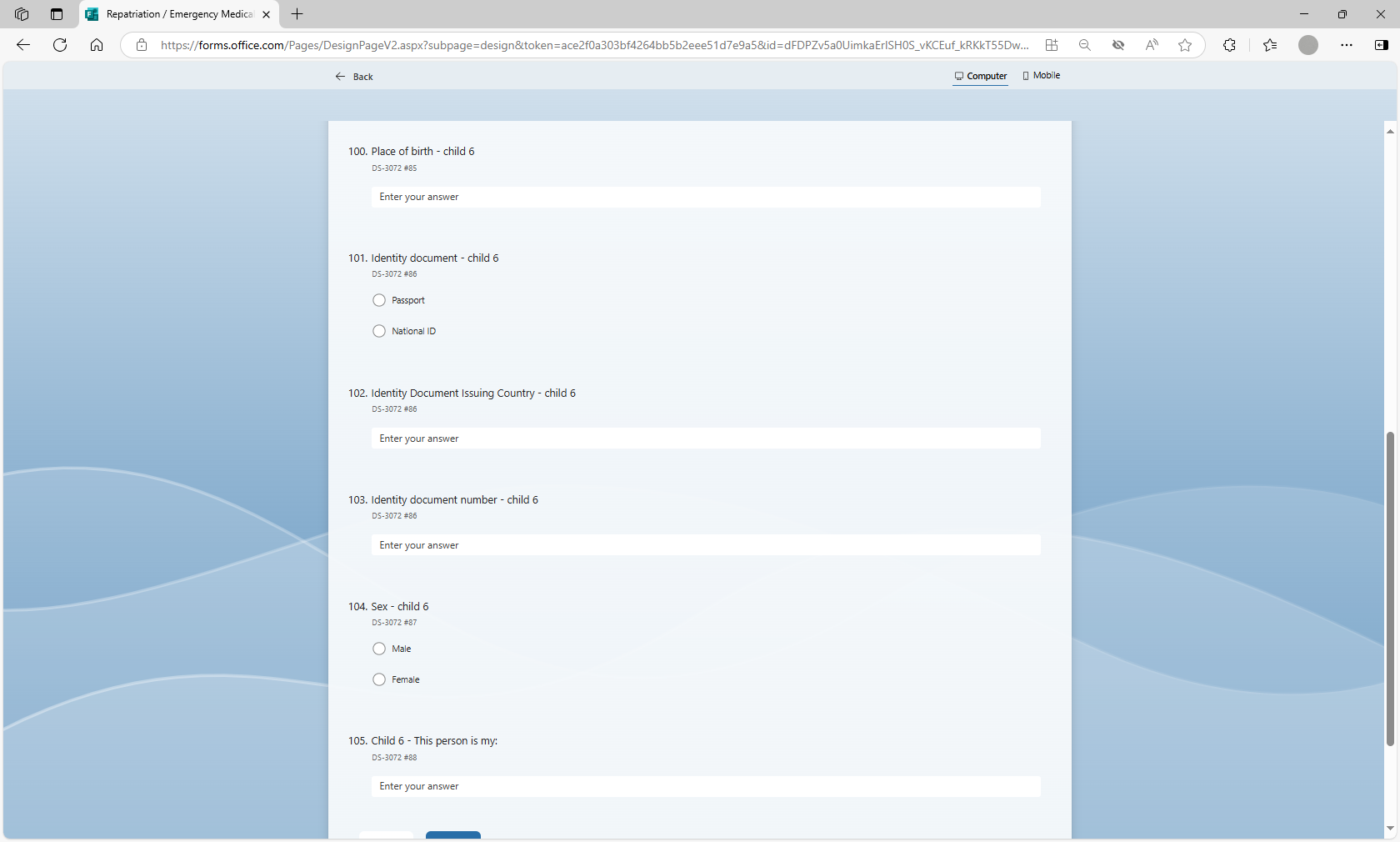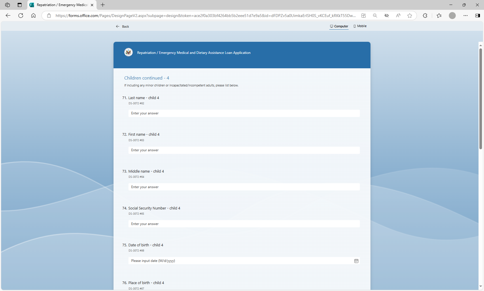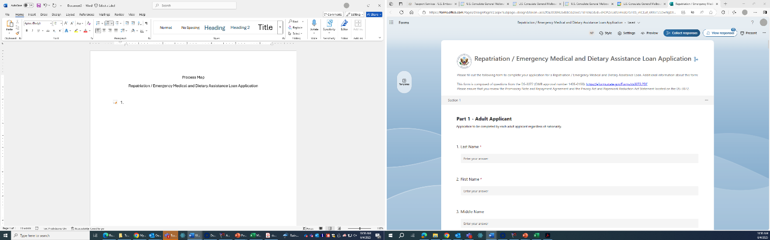 The MS form will be utilized by loan applicants to more efficiently submit their information for a repatriation or EMDA loan application to U.S. posts abroad. Posts will utilize the MS Forms tool to auto populate the form DS-3072 to prepare the form prior to the applicant’s arrival at the U.S. Consulate or Embassy, thereby streamlining the application review and approval process.
