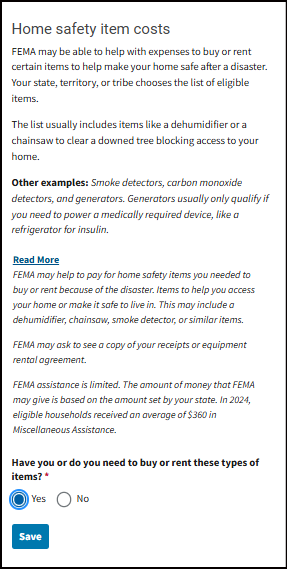 • Other Needs Assistance - This can help with some immediate needs when you can't live in your home. It may cover certain losses and expenses caused by the disaster. Things like personal property and vehicle losses; medical, dental, child care, moving and storage, and funeral expenses."