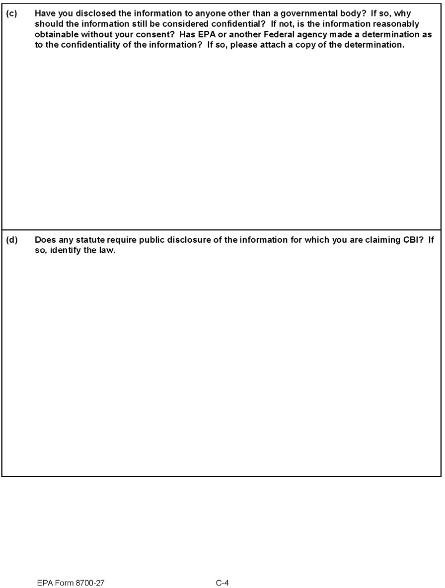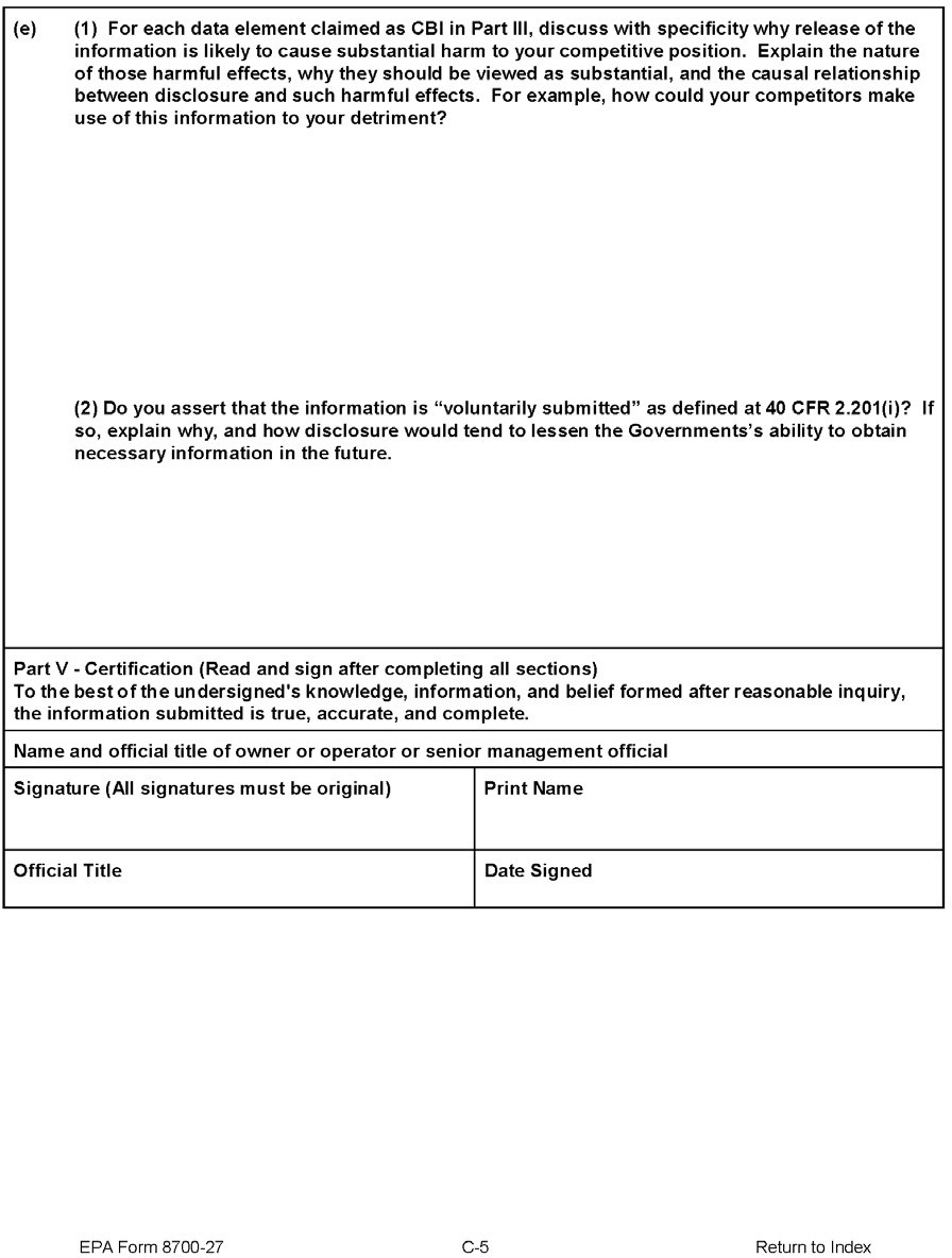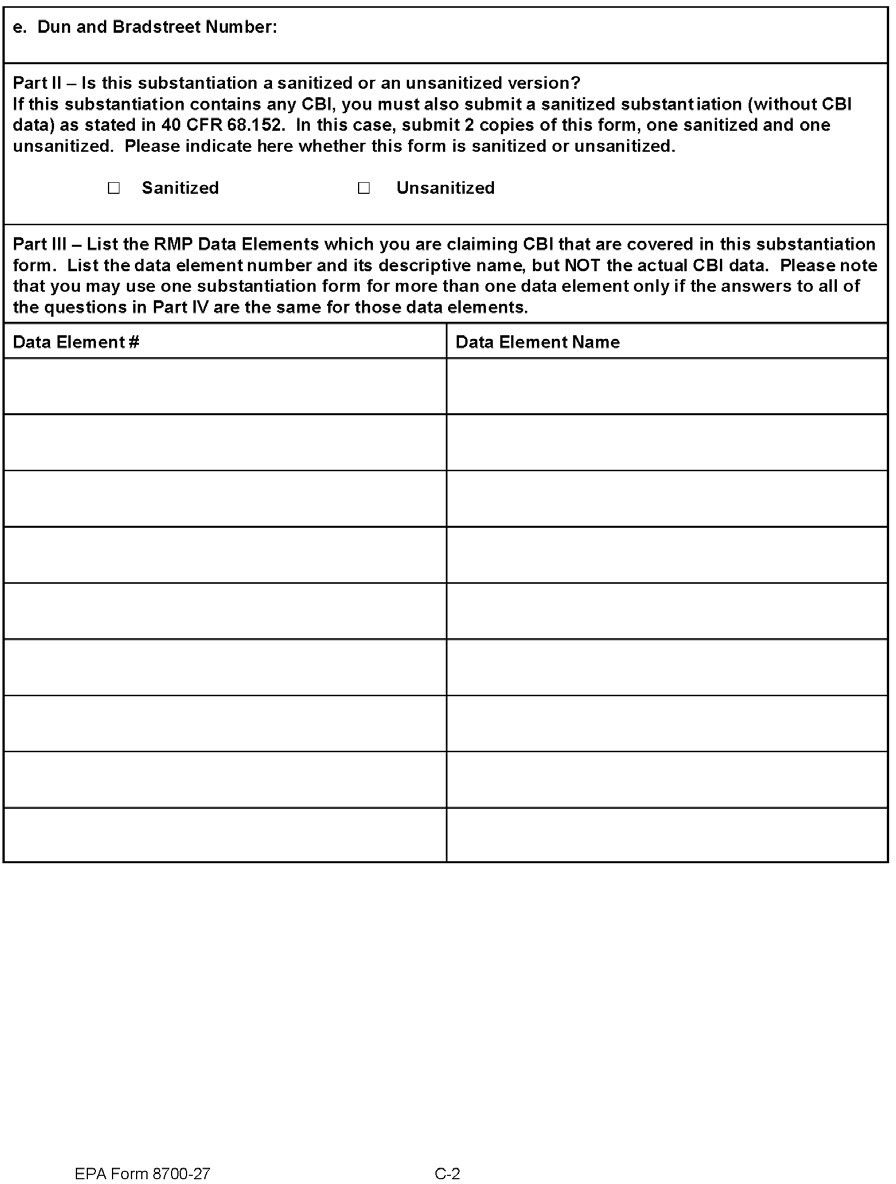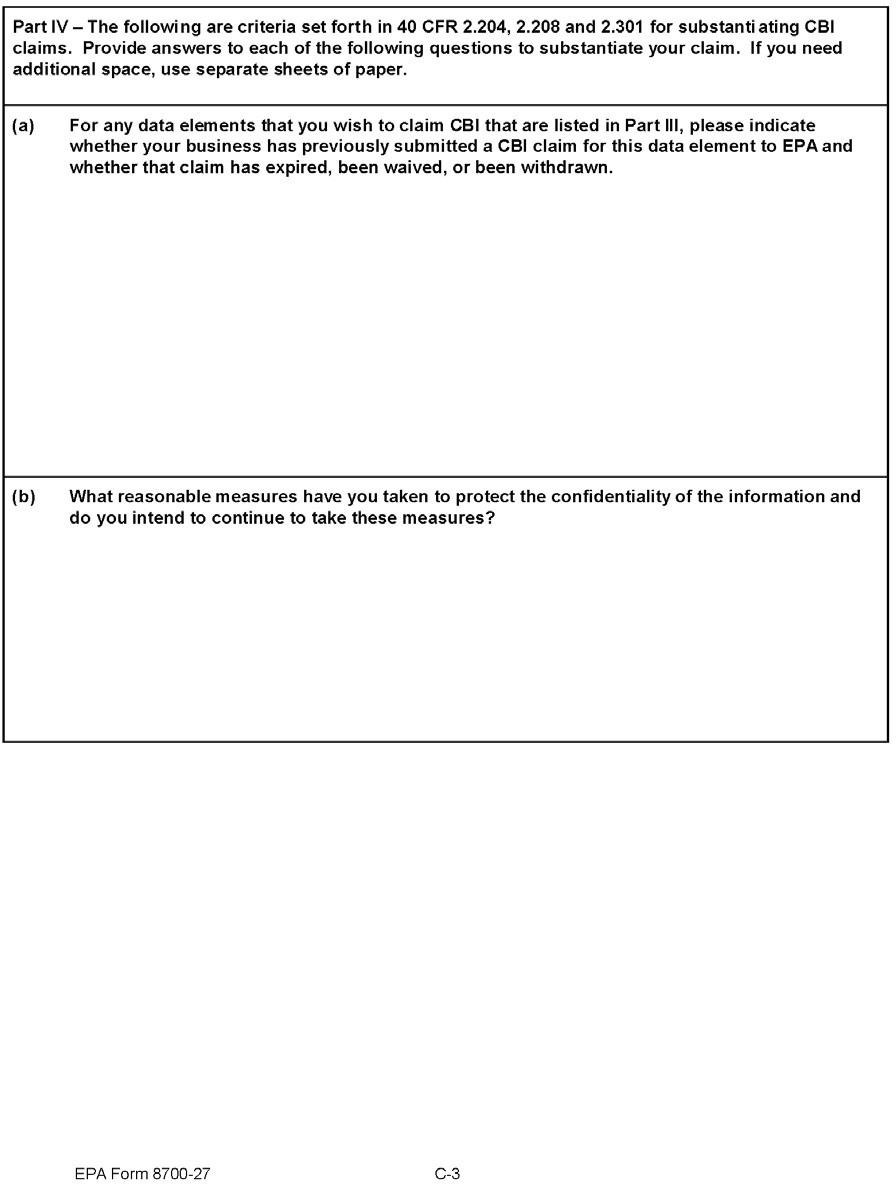 The annual public reporting and recordkeeping burden for this collection of information for those sources that claim CBI is estimated to average 9.5 hours per claim. This collection of information is approved by OMB under the Paperwork Reduction Act, 44 U.S.C. 3501 et seq. (OMB Control No. 2050-0144). Responses to this collection of information are mandatory (40 CFR 370.40 to 370.42). An agency may not conduct or sponsor, and a person is not required to, respond to a collection of information unless it displays a currently valid OMB control number. Form completion and mailing instructions can be found at https://www.epa.gov/rmp/rmpesubmit-users-manual. Send comments on the Agency's need for this information, the accuracy of the provided burden estimates, and any suggested methods for minimizing respondent burden, including through the use of automated collection techniques to the Director, Collection Strategies Division, U.S. Environmental Protection Agency (2822T), 1200 Pennsylvania Ave., NW, Washington, D.C. 20460. Include the OMB control number in any correspondence. Do not send the completed form to this address.