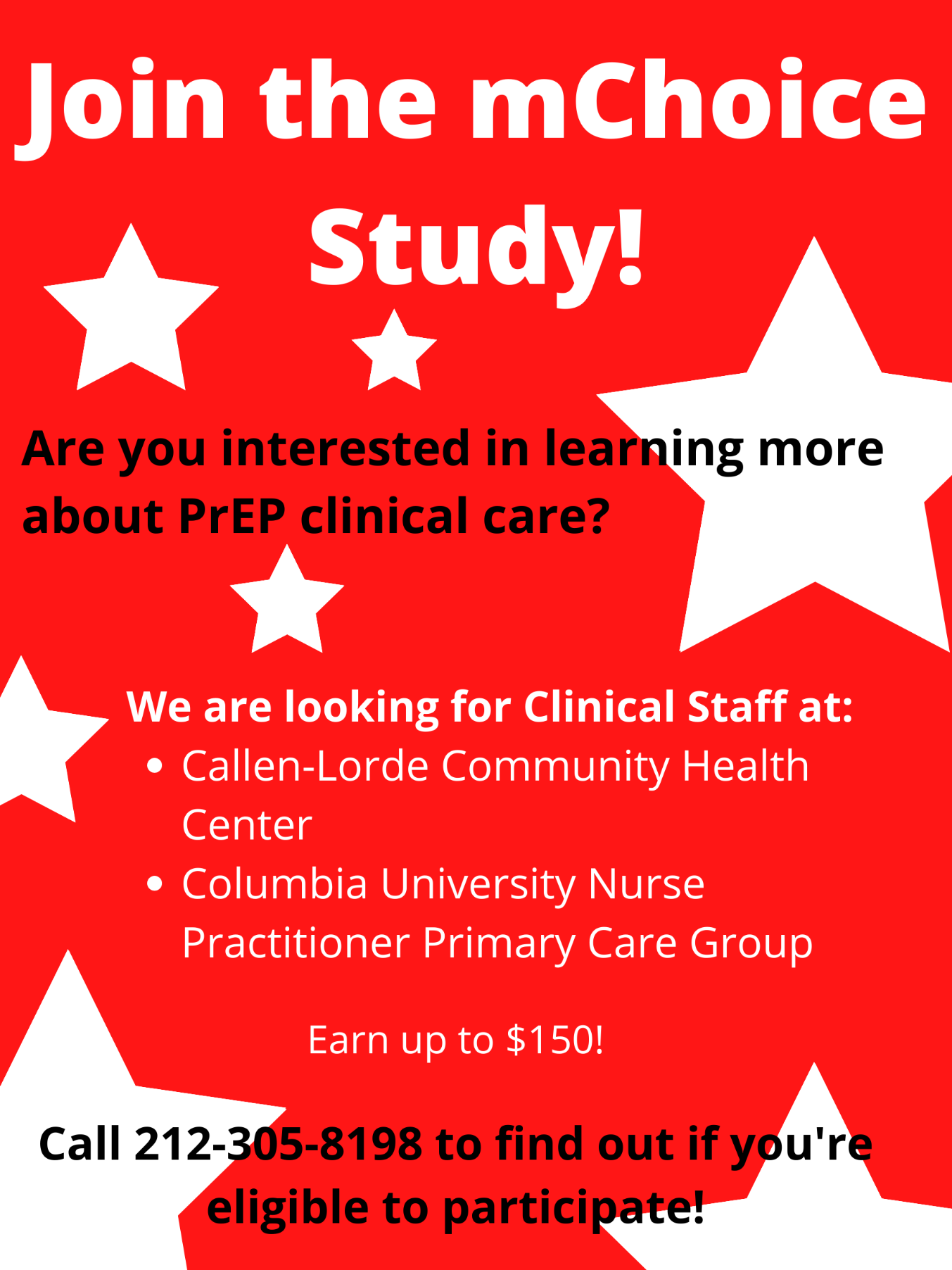 I hope this email finds you well. We are conducting a research study called mChoice: Improving PrEP Uptake and Adherence among Minority MSM through Tailored Provider Training and Adherence Assistance in Two High Priority Settings study at [Study Site] to better understand provider experience with PrEP care, clinic processes, and clinic cultures. I am reaching out to see if you would be interested in participating in this paid research study. Participating clinicians will receive $150. Please respond to this email if you are interested or for more information. Thank you and have a great day!