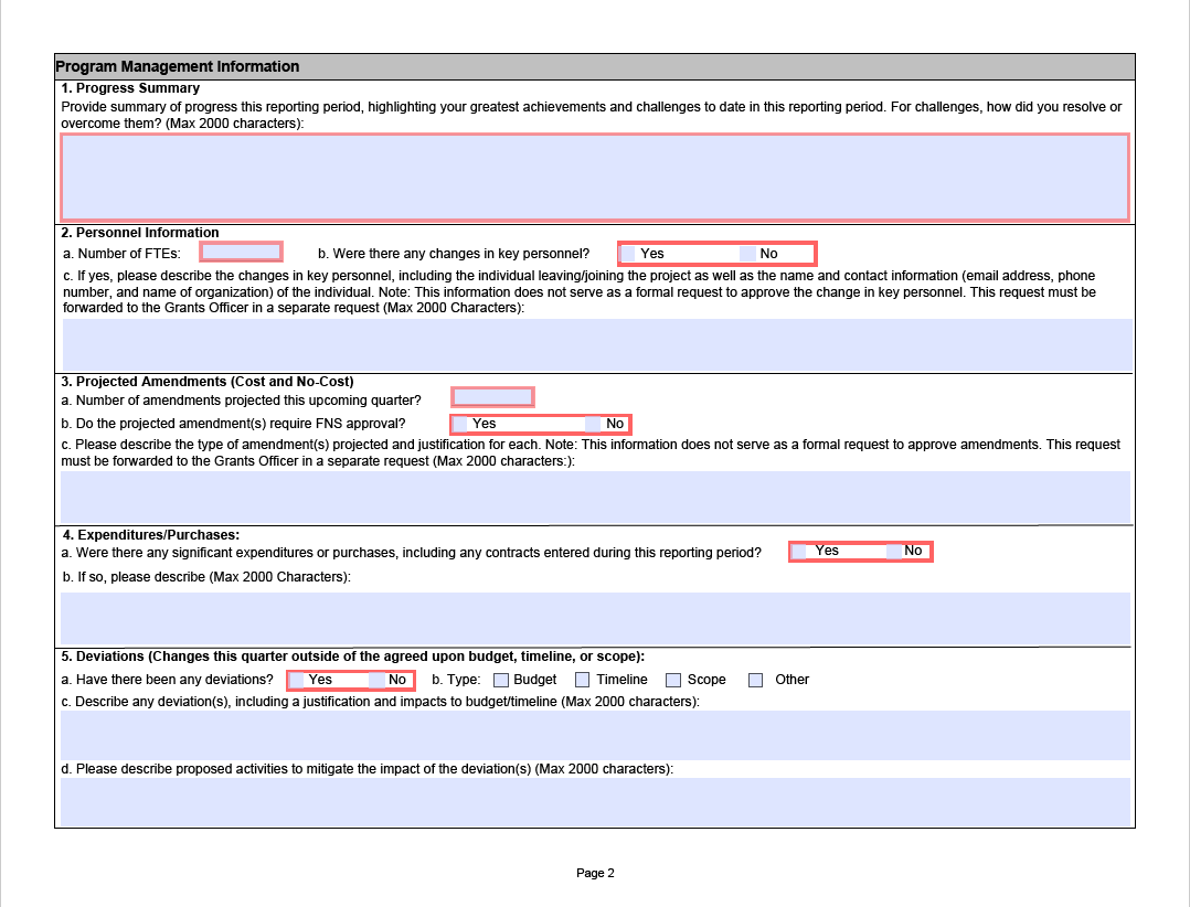 Note: This section describes progress report requirements and introduces the FNS-908 PPR form. All RFAs are required to include the PPR form and all grantees are required to use the FNS-908 PPR form when submitting Progress Reports.