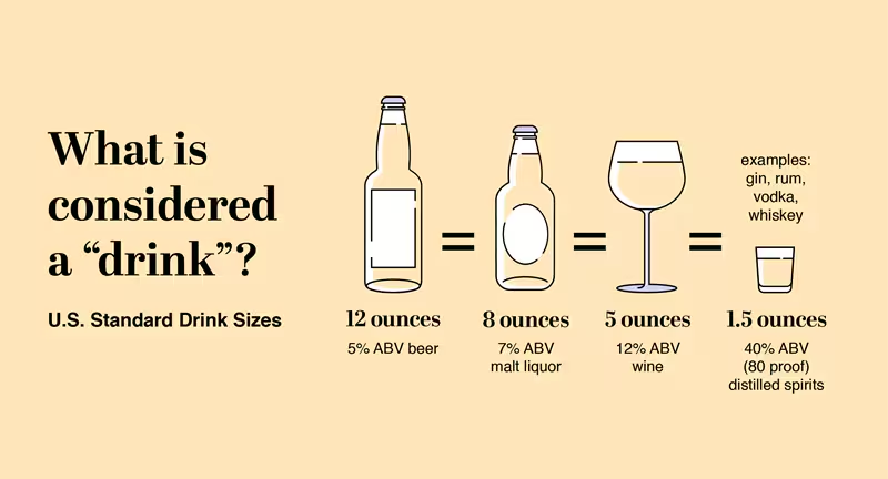 [KNOWLEDGE4] A standard drink of 12% alcohol-by-volume wine is 3 oz., a standard drink of 5% alcohol beer is 16 oz., and a standard drink of 80-proof alcohol is 2 oz.