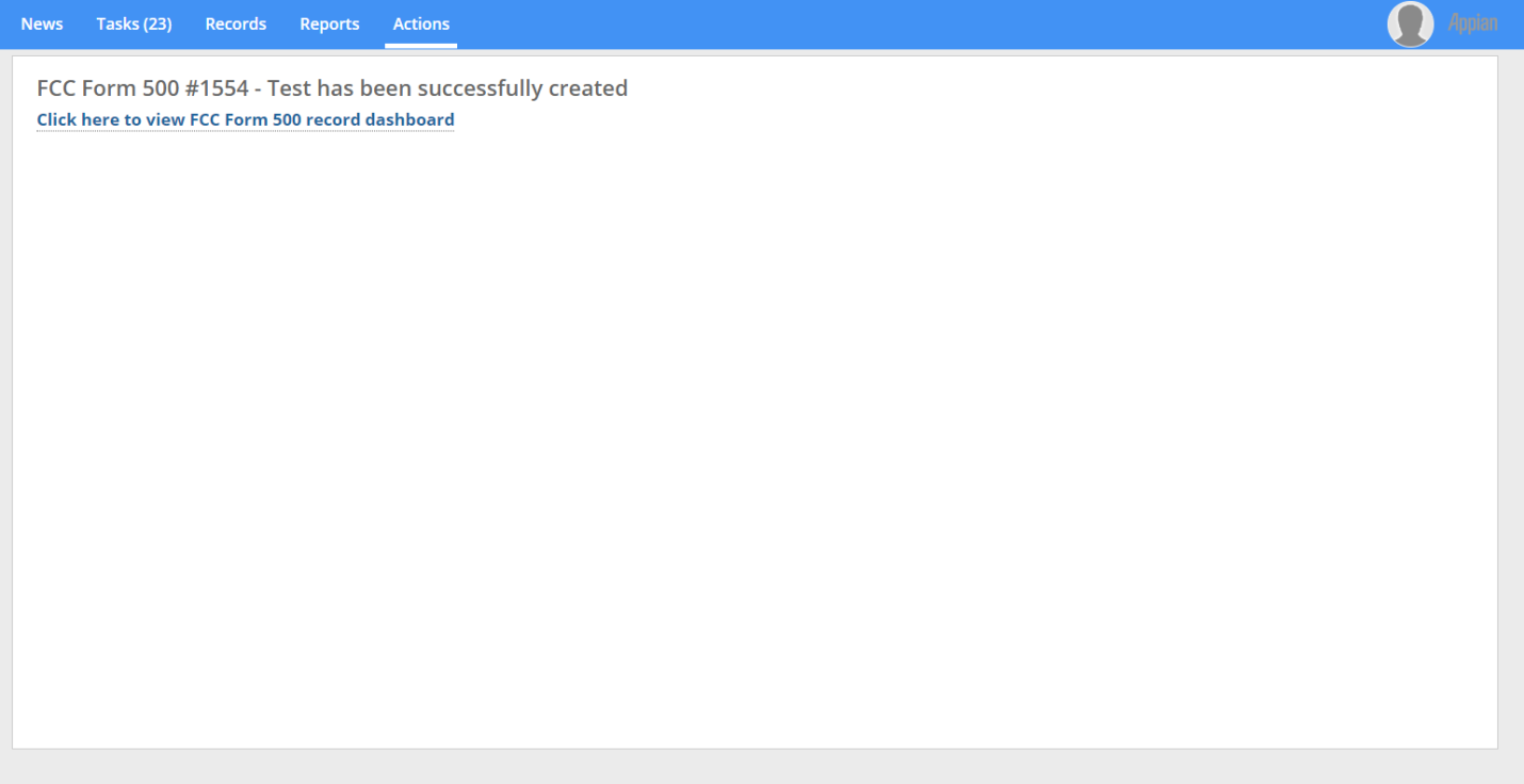 After the FCC Form 500 has been certified, a notification screen confirms that the FCC Form 500 has been successfully created.