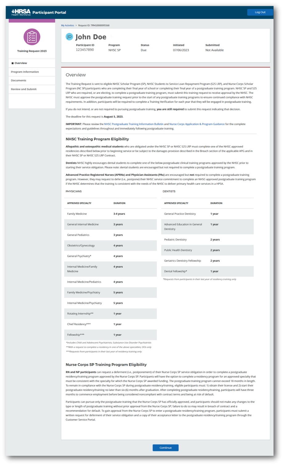 If you are a participant in the following program, discipline, and year in school or training, you are required to submit the Postgraduate Training Request by the due date listed in the NHSC Application and Program Guidance and Postgraduate Training information Bulletin for your program: