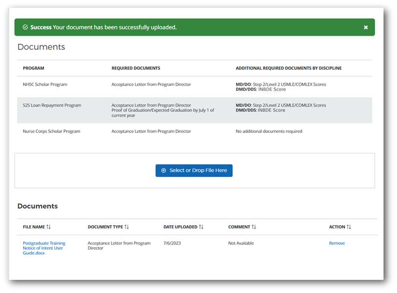 To delete an uploaded document, click the “Remove” button in the Action column of the Documents table.